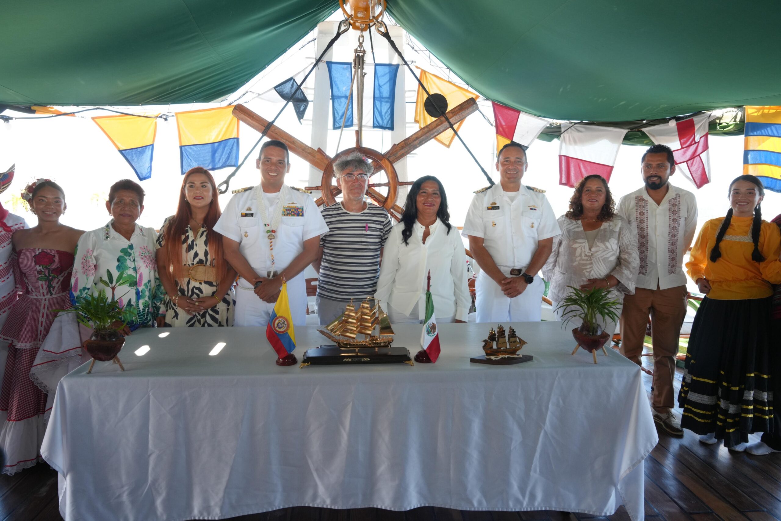 En la presentación estuvieron presentes la secretaria general del Ayuntamiento, Leticia Lozano Zavala; el comandante del Buque Escuela ARC Gloria, Luis Fernando Lara; el agregado naval de la embajada de Colombia, Henry Barón; y la regidora presidenta de la Comisión de Bienestar Social, Marlén González Gómez, además de representantes diplomáticos y autoridades municipales.