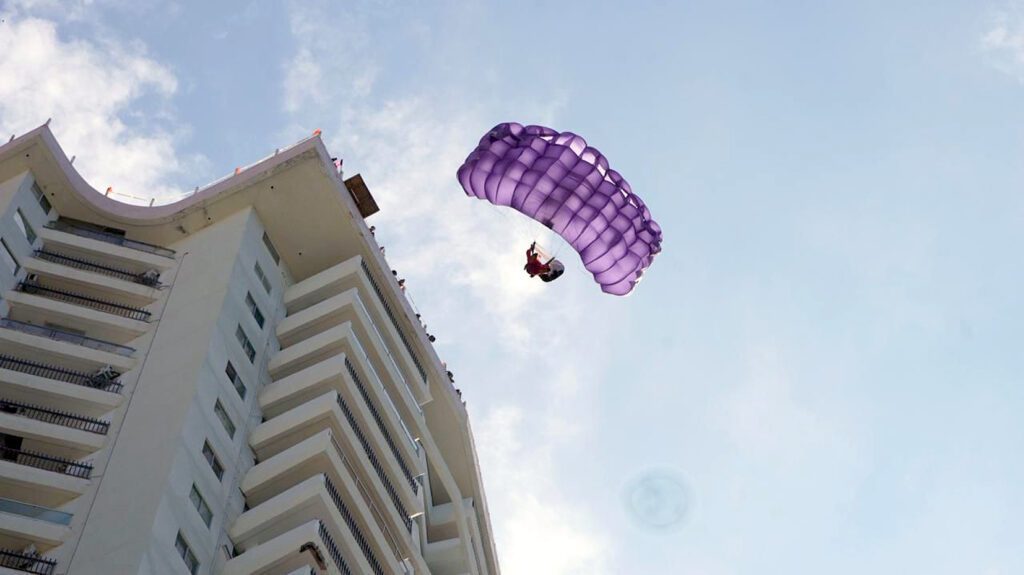 Los saltos con paracaídas comenzaron por la mañana desde la parte más alta del condominio La Palapa, en playa Icacos, donde fue instalada una plataforma de madera utilizada por los participantes para tomar impulso y lanzarse al vacío.