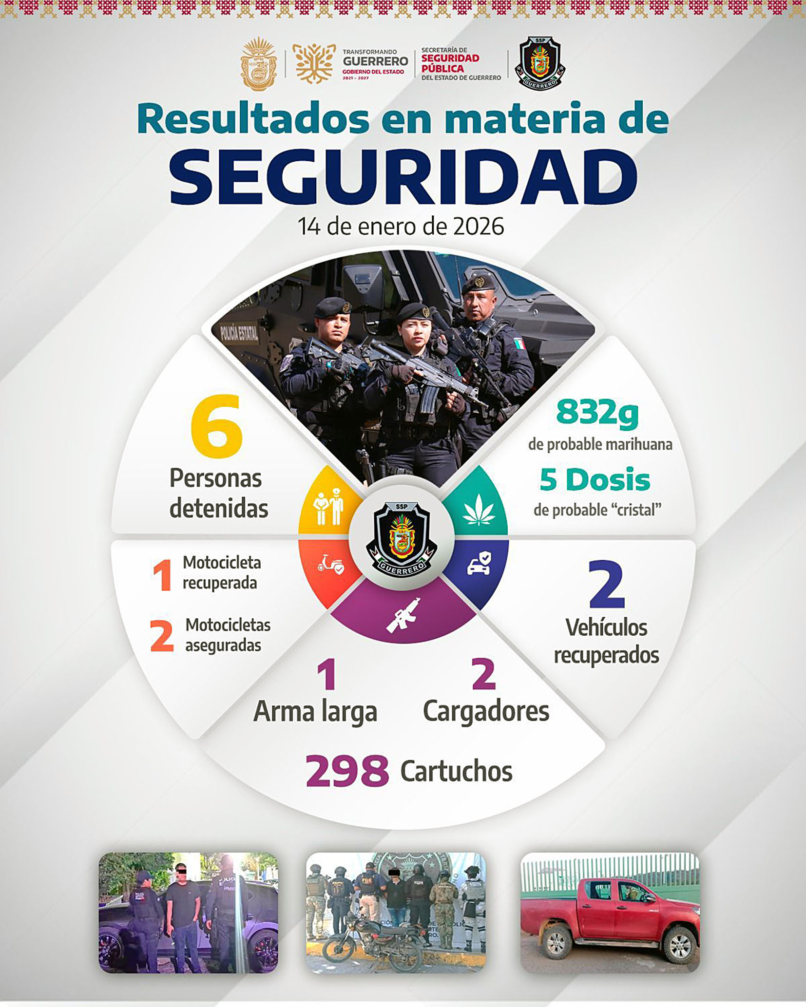 Chilpancingo, Gro., El trabajo interinstitucional en Guerrero genera resultados en materia de seguridad. Con detenciones y aseguramientos, la Secretaría de Seguridad Pública Estatal trabaja de manera decidida en la atención a la violencia y la construcción de la paz.