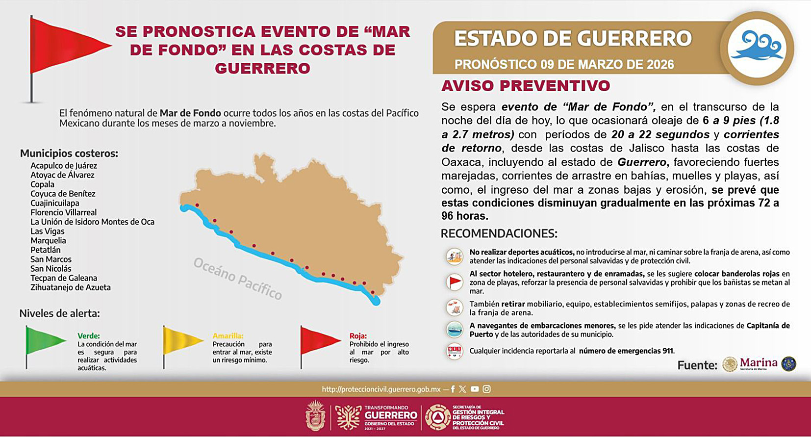 Chilpancingo, Gro., La Secretaría de Gestión Integral de Riesgos y Protección Civil del Estado de Guerrero informa que se pronostica un evento de Mar de Fondo durante la noche de este día en las costas del estado.