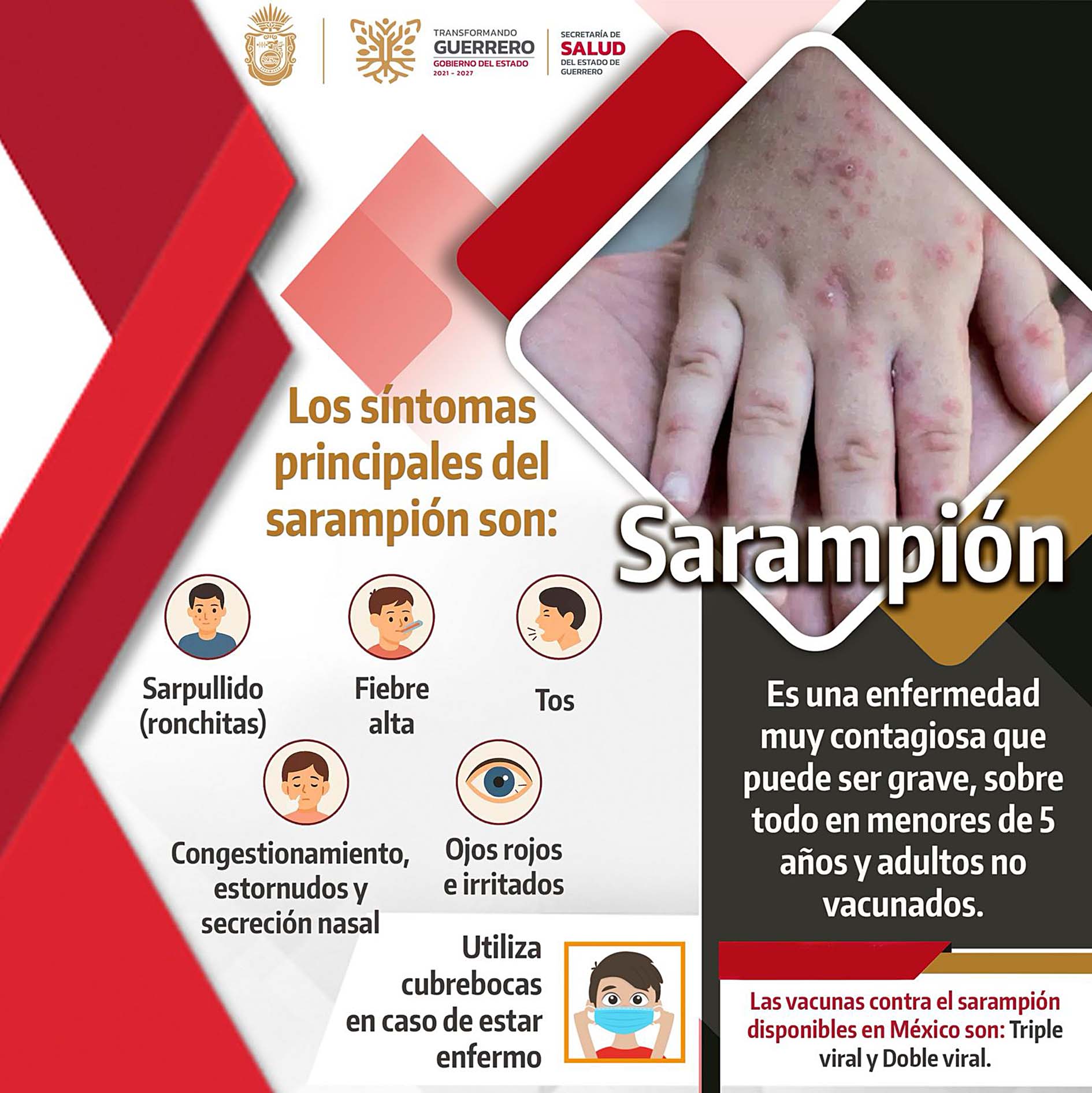 De acuerdo con información difundida en una campaña preventiva, el sarampión es una enfermedad altamente contagiosa que puede derivar en complicaciones graves si no se atiende a tiempo. Entre los principales síntomas se encuentran el sarpullido o ronchitas en la piel, fiebre alta, tos, así como congestión, estornudos y secreción nasal. También se presentan ojos rojos e irritados.