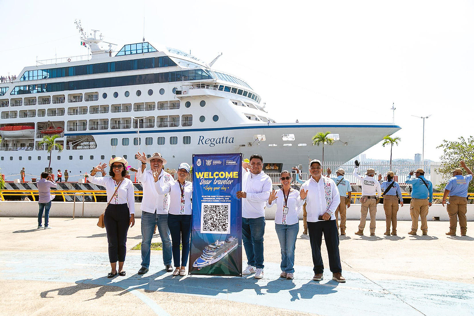 Consignado a través de la agencia Representaciones Marítimas S.A. de C.V., el MS Regatta llegó a las 12:00 horas, generando una importante movilidad económica en beneficio de los prestadores de servicios turísticos del puerto.