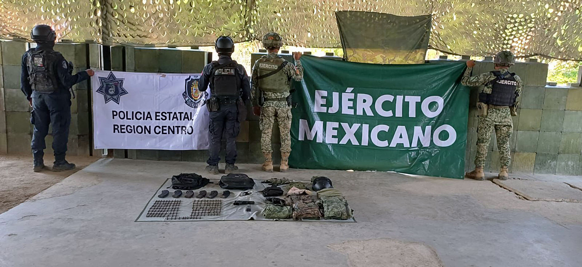 Tierra Colorada, Gro., La coordinación interinstitucional entre la Policía Estatal y el Ejército Mexicano, integrantes de la Base de Operaciones Interinstitucionales (B.O.I.), permitió el aseguramiento de armamento, equipo táctico y probable enervante en el municipio de Juan R. Escudero.