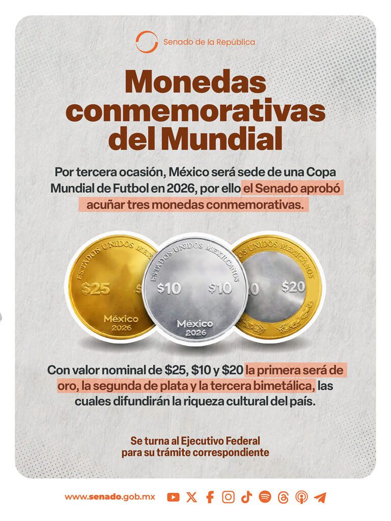 Ciudad de México, Tras la publicación en el Diario Oficial de la Federación (DOF) de la disposición que autoriza la creación de piezas especiales para celebrar el torneo internacional que se disputará en conjunto con Estados Unidos y Canadá, se confirmó que México emitirá nuevas monedas conmemorativas por la Copa Mundial 2026.