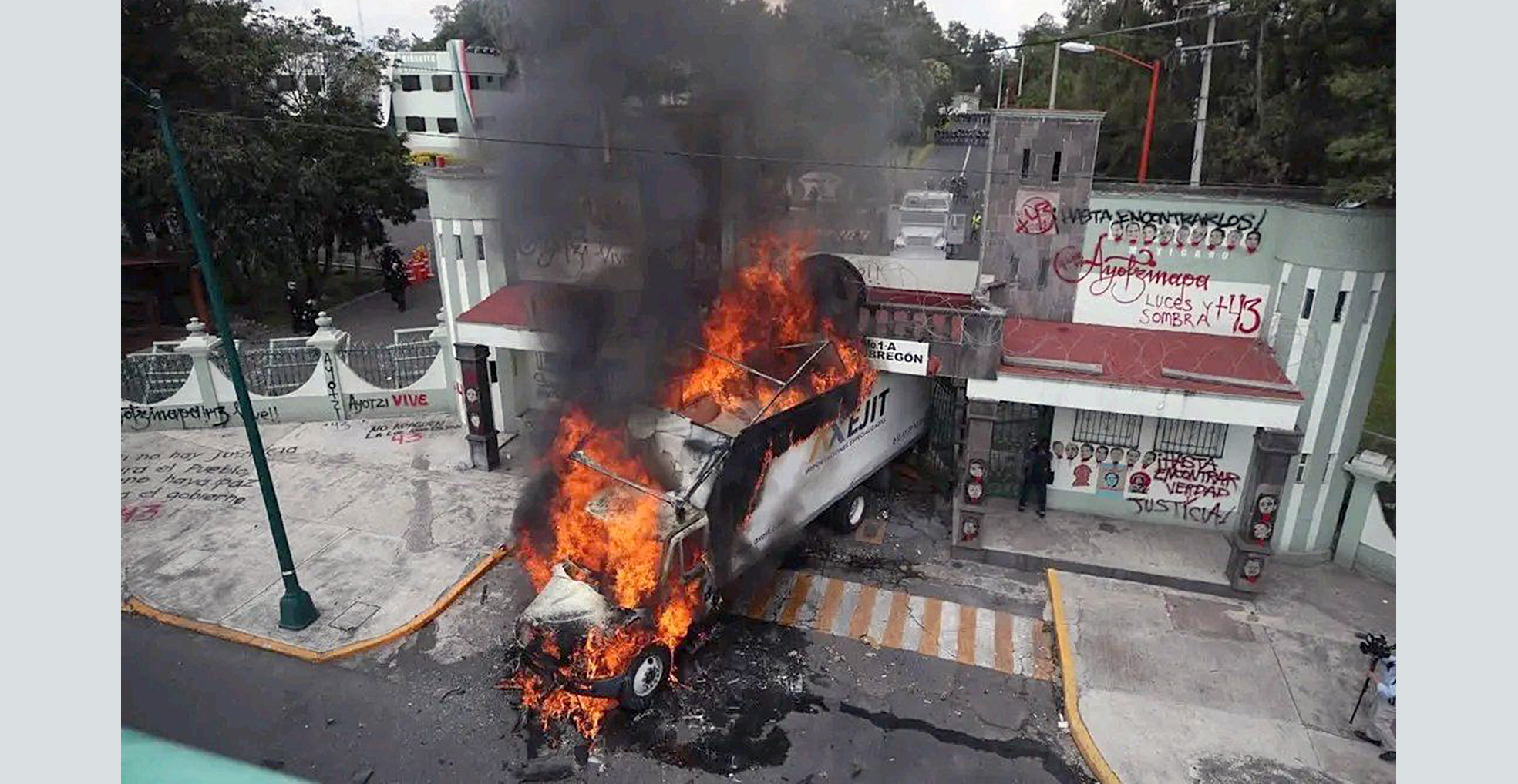 Al término del mitin, el contingente de padres y mujeres normalistas se retiró del lugar. Sin embargo, un grupo de avanzada permaneció en el sitio y lanzó artefactos explosivos de fabricación casera al interior del Campo Militar No. 1. Minutos después, otro grupo de manifestantes interceptó un camión de carga en la avenida, lo condujo en reversa hacia el portón principal de acceso y lo estrelló contra la reja, la cual fue derribada. Acto seguido, el camión fue incendiado tras ser atacado con petardos. También se lanzaron piedras y más explosivos hacia el interior del complejo militar. Posteriormente, los normalistas se retiraron del lugar y elementos del cuerpo de Bomberos acudieron para sofocar el incendio.