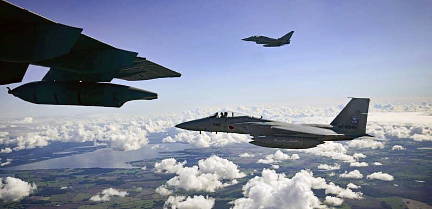 A Japanese Air Self-Defense Force F-15 fighter jet (front) and a German Eurofighter are seen in flight during a joint demonstration as part of a press day at the military air base in Laage, south of Rostock, northeastern Germany on September 23, 2025. (Photo by Tobias Schwarz / AFP)