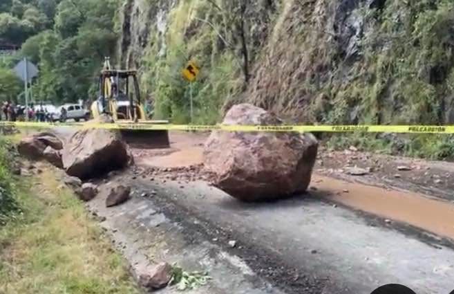 Taxco, Gro., Octubre 7.- En la carretera nacional Taxco–Cuernavaca, a la altura del lugar conocido como La Cuña, se registró un derrumbe de rocas y un deslizamiento de tierra ocasionados por las recientes lluvias en el municipio platero.