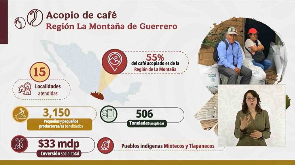 En total se han acopiado 913.56 toneladas de café, con una inversión de 59.4 millones de pesos. Solo en Guerrero se trabaja en el 40% de los sistemas cafetaleros, en 15 localidades, beneficiando a 3,150 pequeños productores, de los cuales el 55% son mujeres, con inversión directa en la Montaña y Costa Grande asciende a 33 millones de pesos, en apoyo a pueblos indígenas mixtecos y tlapanecos.