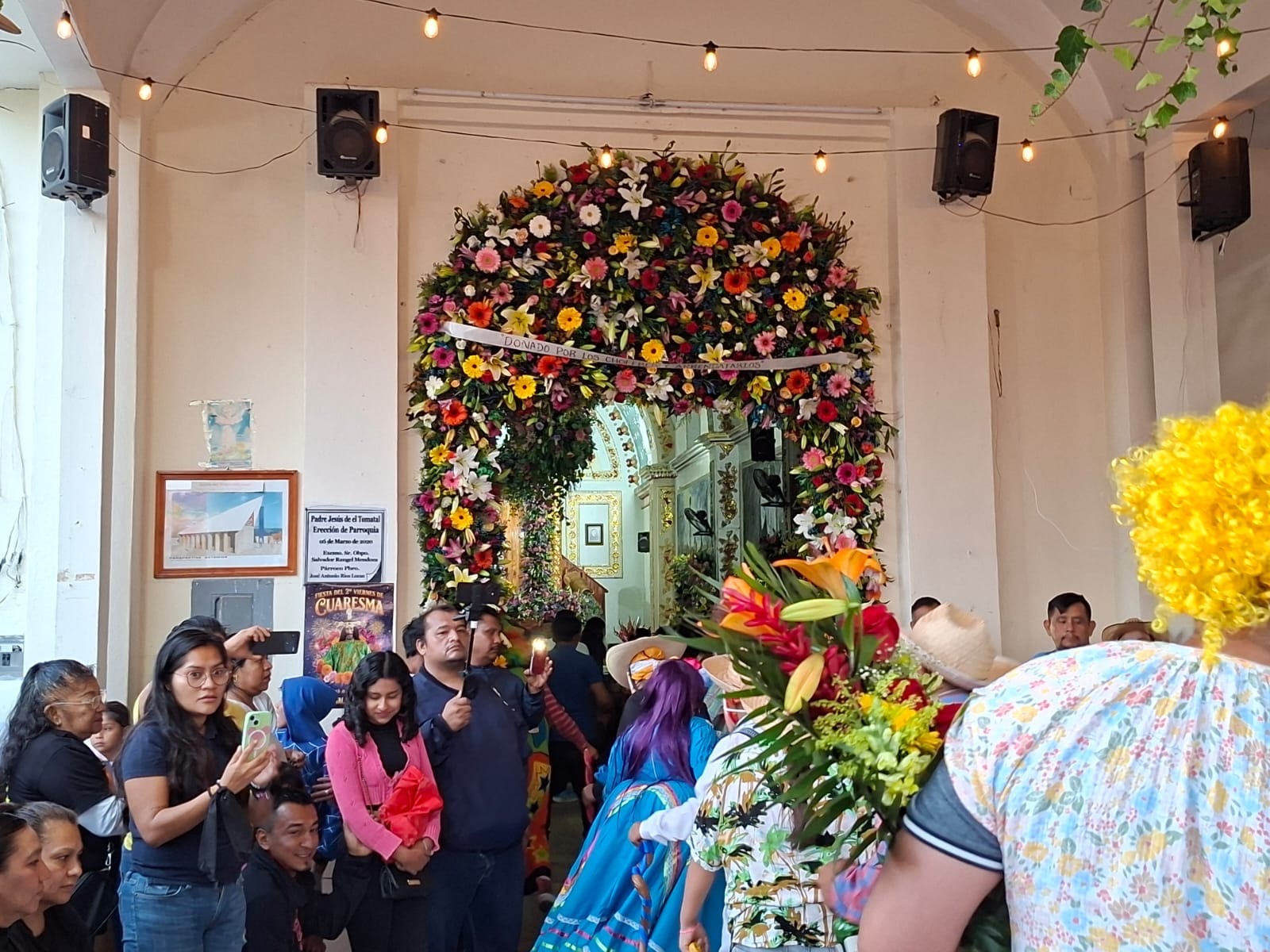 Iguala, Guerrero, Febrero 28.- A las 6:00 am dio inicio la comparsa de 7 danzas provenientes de varios municipios, entre ellos Acapulco, acompañaron a llevar el arco de flores naturales que luce en la entrada de la iglesia dedicada a Padre Jesús, santo patrono que se celebra este segundo viernes de Cuaresma.
