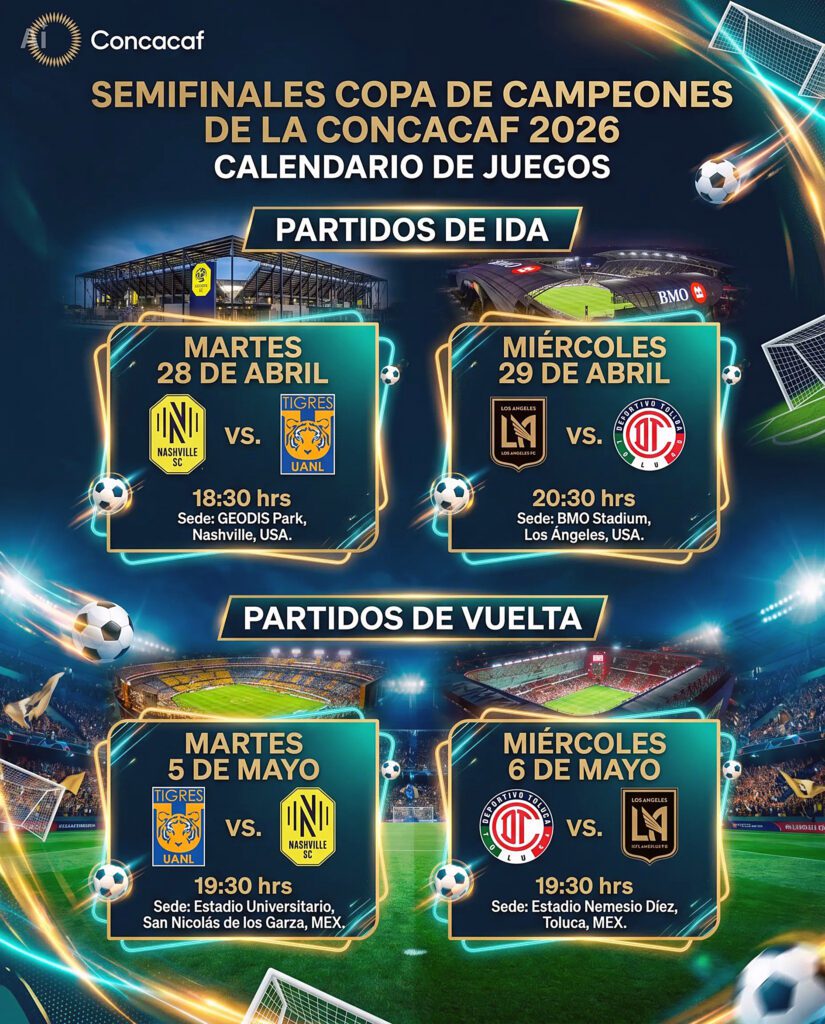 Ciudad de México, Los equipos de la Liga MX y de la MLS, ya conocieron los días y horarios de los partidos de semifinales de la Copa de Campeones Concacaf 2026, donde los encuentros de ida se jugarán a finales del mes de abril y los de vuelta en la primera semana del mes de mayo.