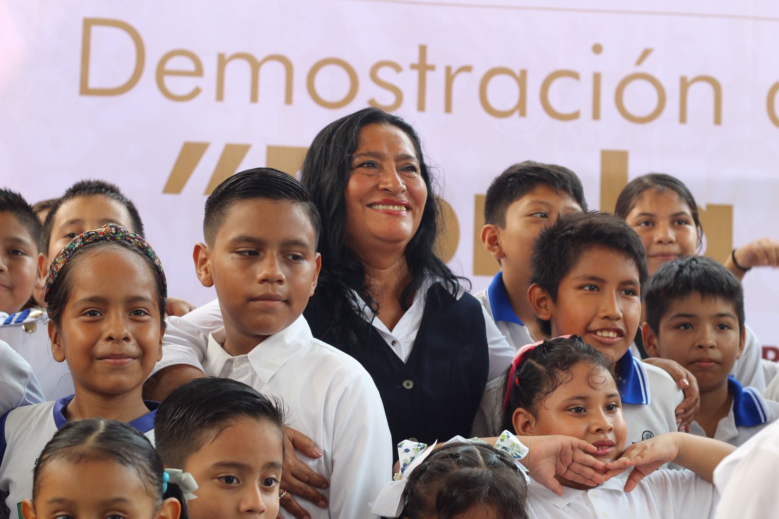 Acapulco, Gro., Noviembre 19.- La presidenta municipal, Abelina López Rodríguez, encabezó en la colonia Progreso la Demostración de Oratoria por la Paz, ejercicio dirigido a fortalecer la expresión infantil como eje de la estrategia Paz, Honestidad y Corazón para la Reconstrucción de Acapulco, impulsada por su gobierno desde la Secretaría General.