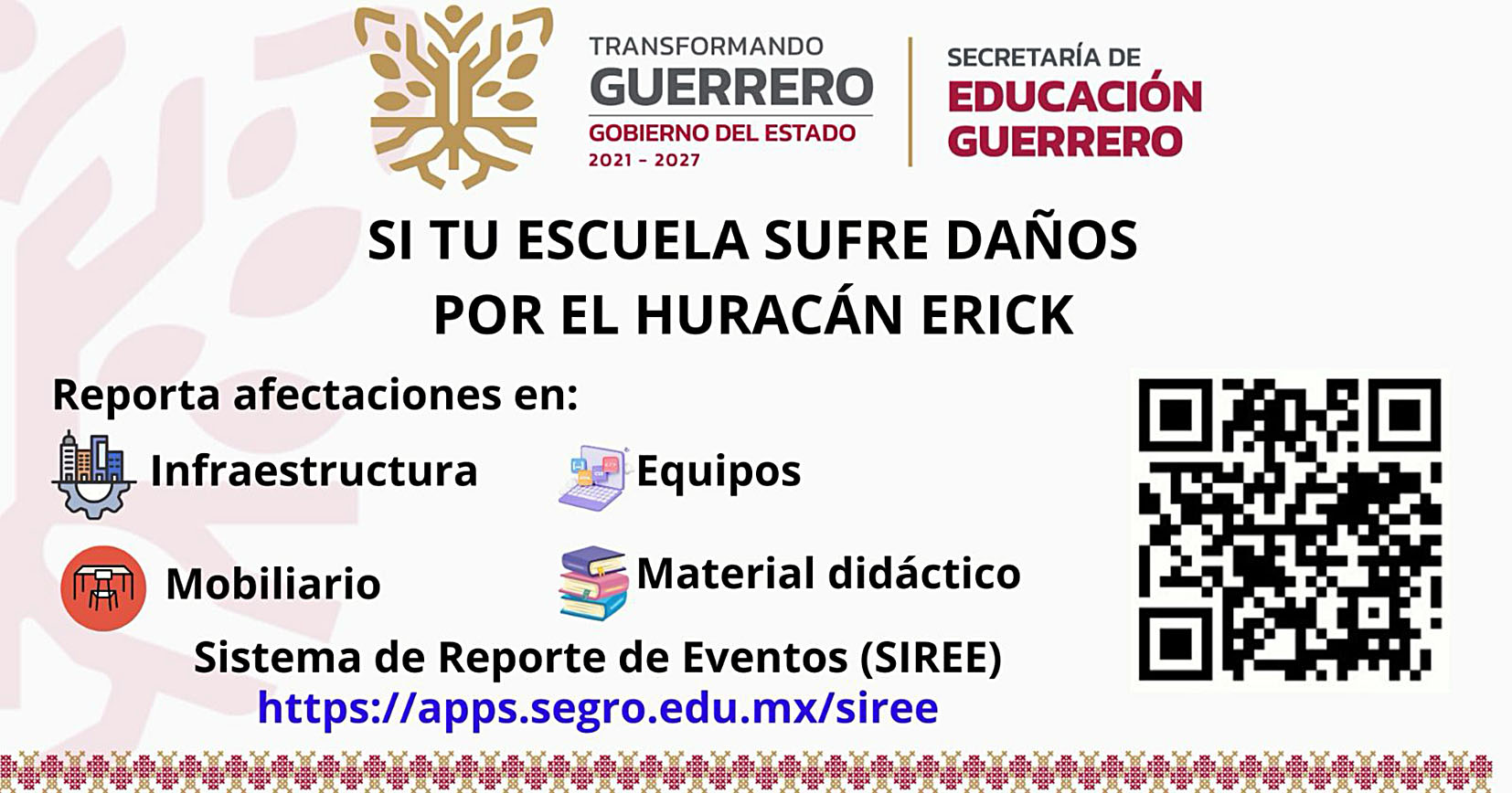 Chilpancingo, Gro., Por instrucciones de la gobernadora Evelyn Salgado Pineda, la Secretaría de Educación Guerrero (SEG) solicita a la comunidad escolar reportar cualquier tipo de afectación en planteles, a causa del huracán Erick, a través del Sistema de Reporte de Eventos (SIREE).