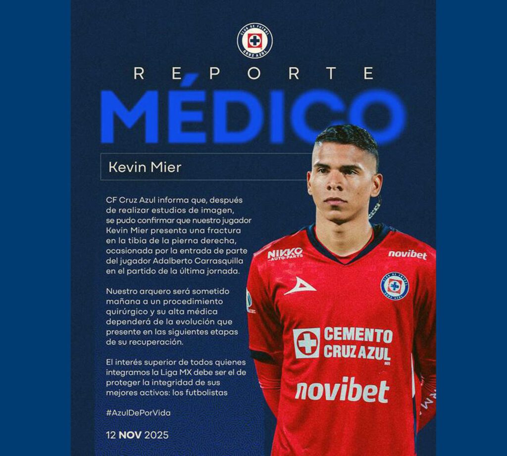 “Kevin Mier presenta una fractura en la tibia de la pierna derecha, ocasionada por la entrada de parte del jugador Adalberto Carrasquilla en el partido de la última jornada”.