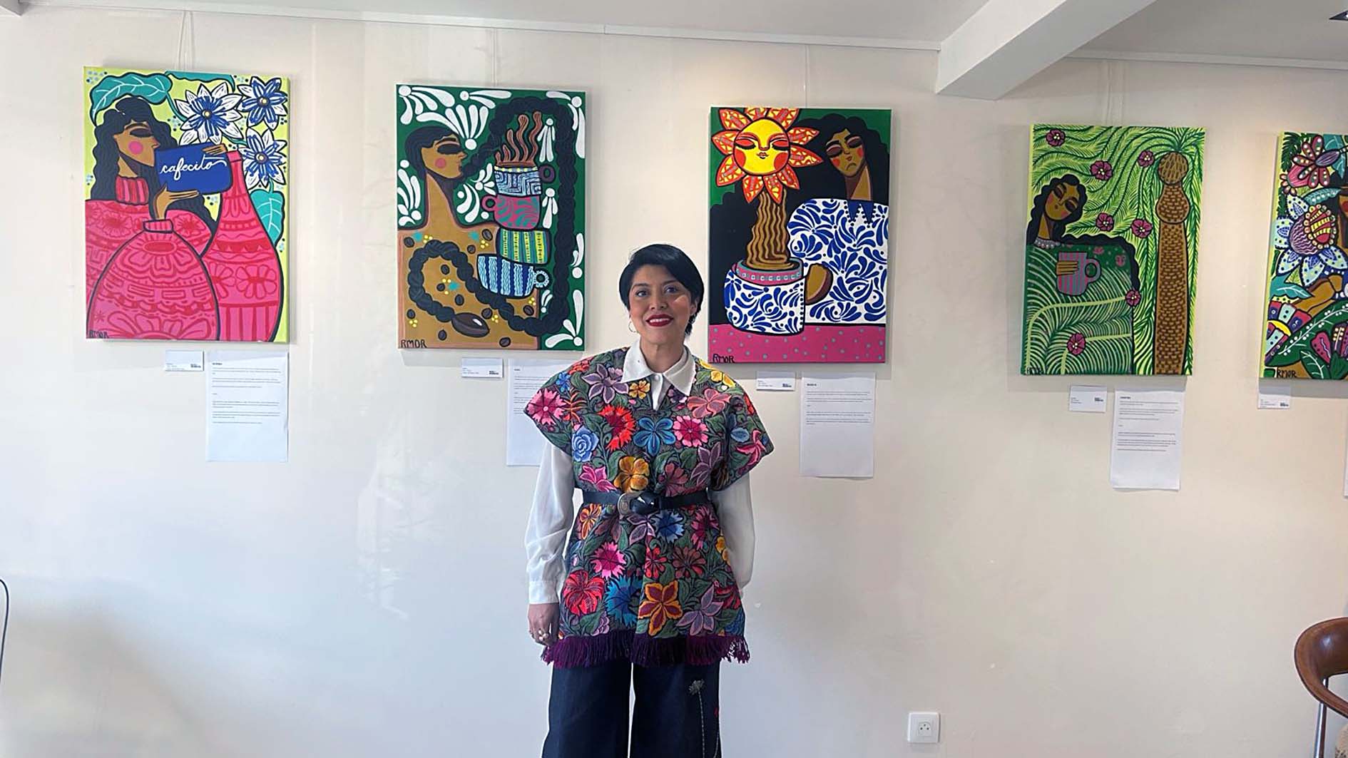 Inspirándose en su tierra natal, Zihuatanejo, la artista plasma escenas donde el café, la flora y la fauna se entrelazan con la vida cotidiana de estas mujeres. A través de su obra, los visitantes descubren relatos poéticos donde el café impregna el cabello, el amor florece en lo cotidiano y la naturaleza se convierte en guía de vida. Cada pieza es un reflejo de la identidad mexicana: cálida, resiliente y profundamente humana.