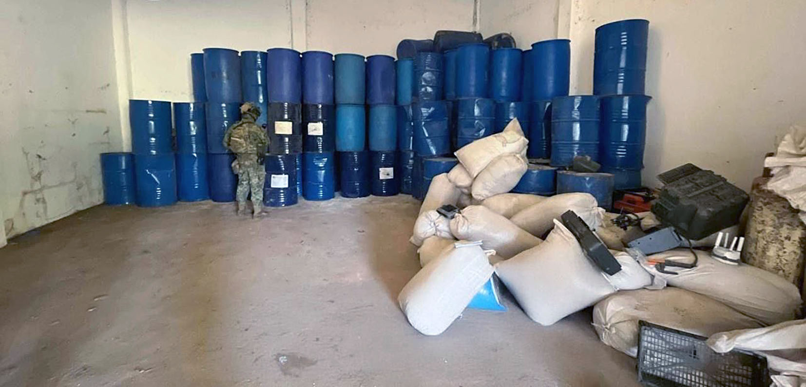 De acuerdo con información oficial, durante recorridos terrestres las fuerzas federales localizaron una bodega en la que fueron asegurados e inhabilitados en el sitio aproximadamente 24 mil 920 litros y más de 12 mil 200 kilogramos de diversas sustancias químicas, presuntamente utilizadas como precursores para la fabricación de drogas sintéticas.