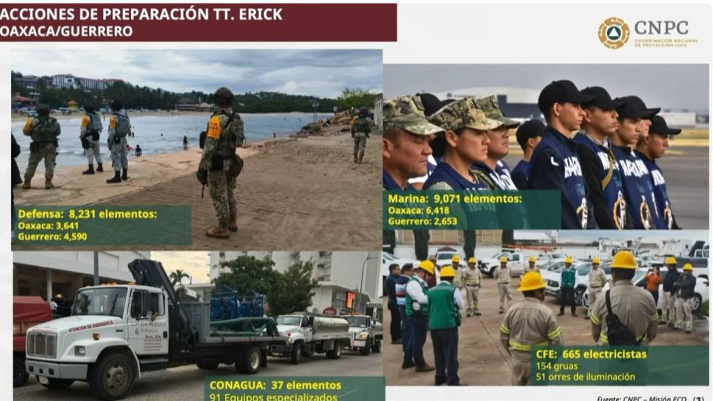 De manera preventiva y ante las afectaciones que pueda dejar el huracán Erick, la Secretaría de la Defensa (Sedena) y de Marina (Semar) desplegaron un total de 17 mil 302 efectivos en Guerrero y Oaxaca.
