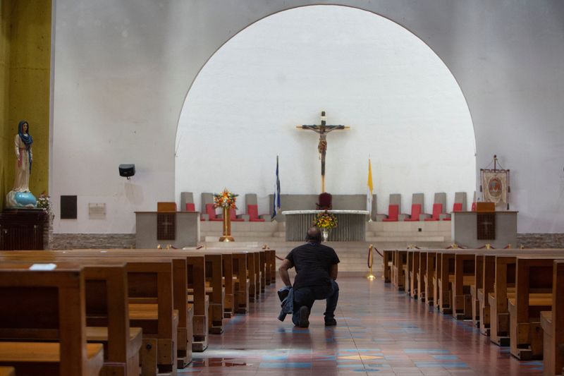 FOTO DE ARCHIVO: Un hombre se arrodilla en la Catedral Metropolitana de la Inmaculada Concepción de María luego de que la policía nicaragüense prohibió una procesión y peregrinación católica en la capital, citando razones de seguridad interna, en Managua, Nicaragua. 12 de agosto, 2022. REUTERS/Maynor Valenzuela/Archivo