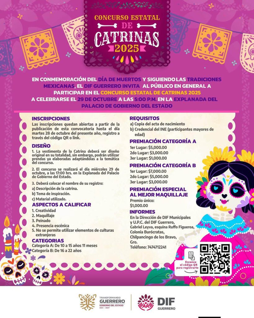 Chilpancingo, Gro., En el marco de la celebración del Día de Muertos 2025, el gobierno del estado, a través del Sistema DIF Guerrero, llevarán a cabo el tradicional Concurso Estatal de Catrinas, donde podrá participar la población en general, resaltando que las inscripciones quedan abiertas a partir de la publicación de la convocatoria, misma que se encuentra publicada en la página oficial del gobierno del estado y del DIF Guerrero.
