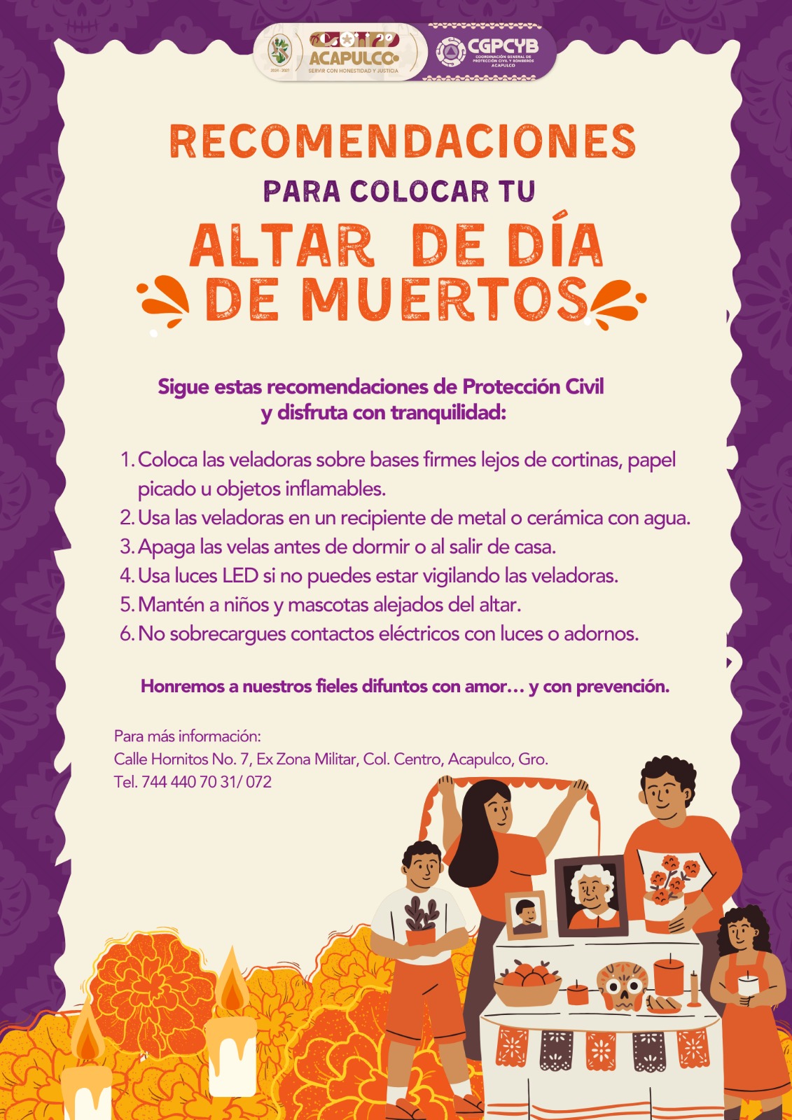 Acapulco, Gro., Octubre 30.- Con el propósito de garantizar la seguridad de las familias acapulqueñas durante las festividades del Día de Muertos, el Gobierno Municipal que encabeza la presidenta Abelina López Rodríguez, a través de la Coordinación General de Protección Civil y Bomberos, emite una serie de recomendaciones preventivas para disfrutar estas tradiciones con tranquilidad y sin incidentes.
