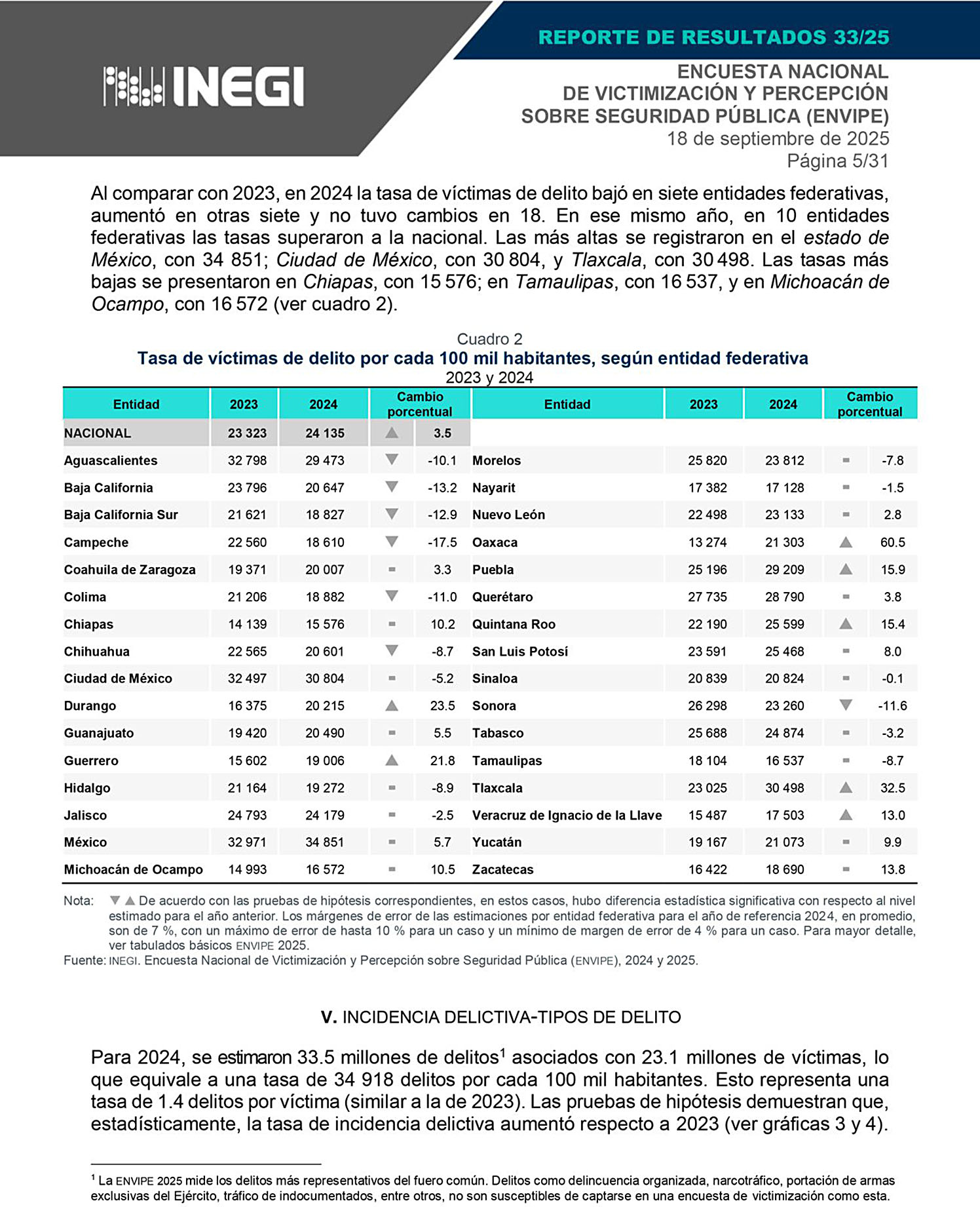 El informe indica que en 2023 se registraron 15 mil 602 víctimas por cada 100 mil habitantes, mientras que en 2024 la cifra ascendió a 19 mil 006. Con estos datos, Guerrero se ubicó entre los siete estados del país con un aumento significativo en la tasa de victimización, junto con Durango, Oaxaca, Puebla, Quintana Roo, Tlaxcala y Veracruz.