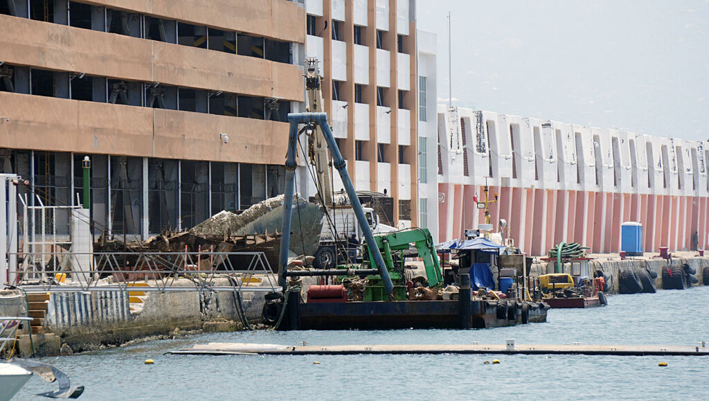 Y a lo largo del Malecón de Acapulco, a un costado de la Terminal Marítima, aún se observan pedazos de fibra de vidrio de gran tamaño, que parecieran ser de cascos de lanchas que permanecen en el fondo del mar.