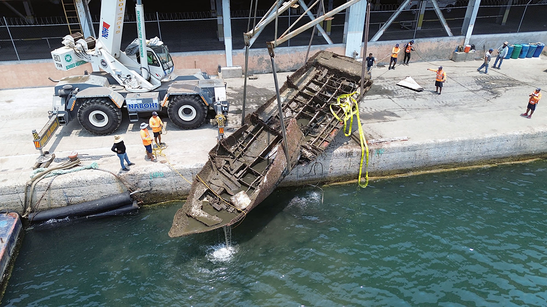 La mañana de este miércoles, con maquinaria trabajaron en la extracción de embarcaciones del fondo del mar en la terminal marítima, como parte del operativo a cargo de la Secretaría de Marina.