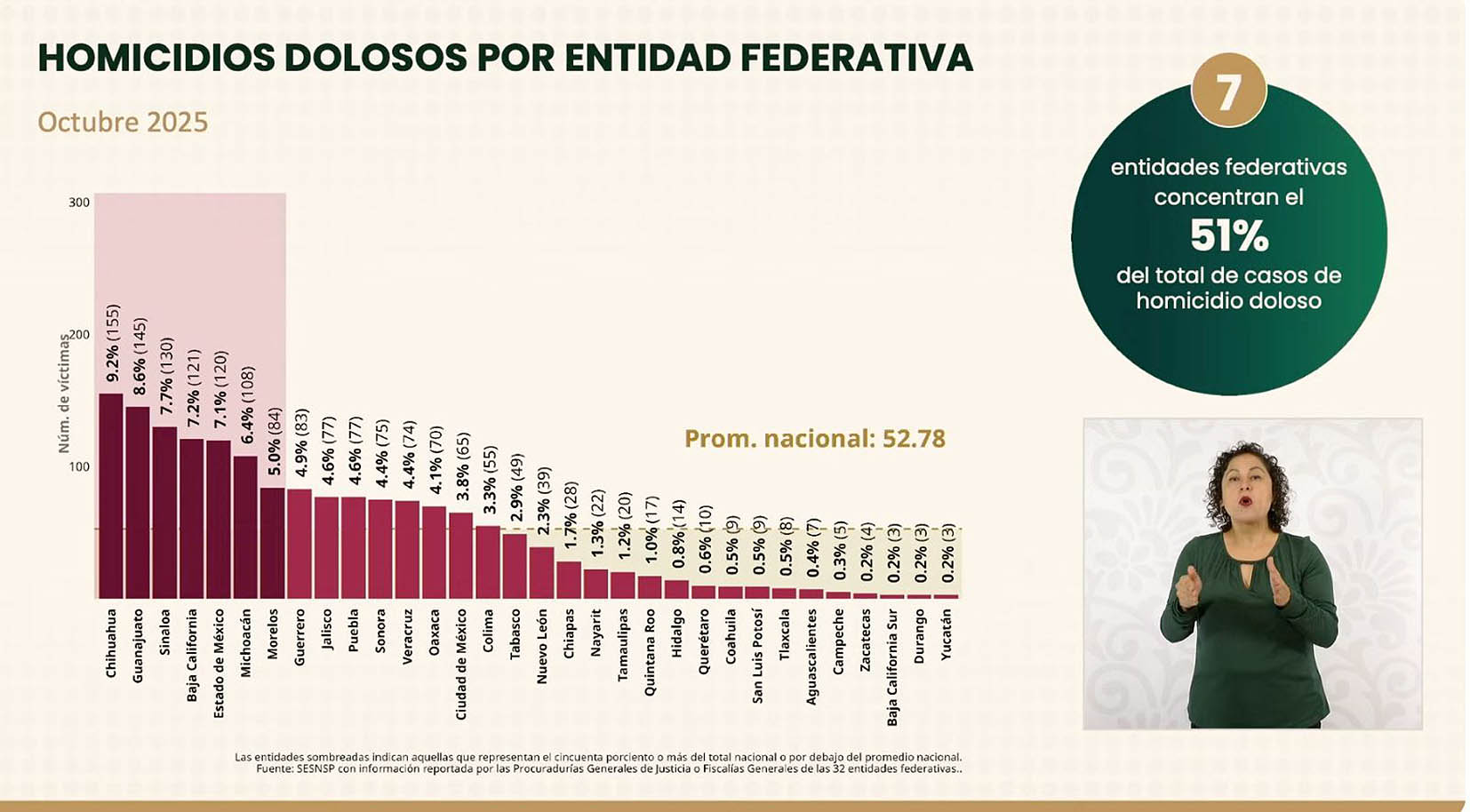 Chilpancingo, Gro., De acuerdo con el informe del Secretariado Ejecutivo del Sistema Nacional de Seguridad Pública, Guerrero registró una disminución del 23.2% en el promedio diario de homicidios dolosos entre enero y octubre de 2025, en comparación con el mismo periodo del año anterior.