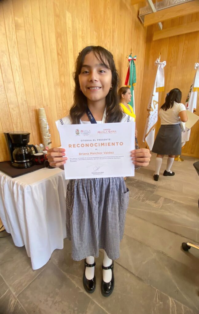 Iguala, Gro., septiembre 8.- El presidente municipal de Iguala, David Gama Pérez, entregó reconocimientos y apoyos económicos a las niñas Guadalupe Frutos Martínez, Catherine González Díaz y Briana Melchor Valdez, quienes resultaron ganadores en las Olimpiada Mexicana de Matemáticas, realizada en el municipio de Oaxtepec, Morelos.