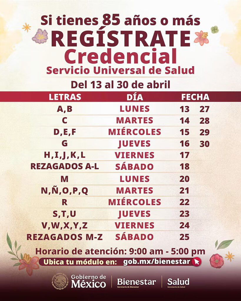 Ciudad de México, La credencialización del Servicio Universal de Salud comienza a partir del 13 de abril, y durante esta primera etapa el registro está dirigido a las y los adultos mayores de 85 años de edad o más.