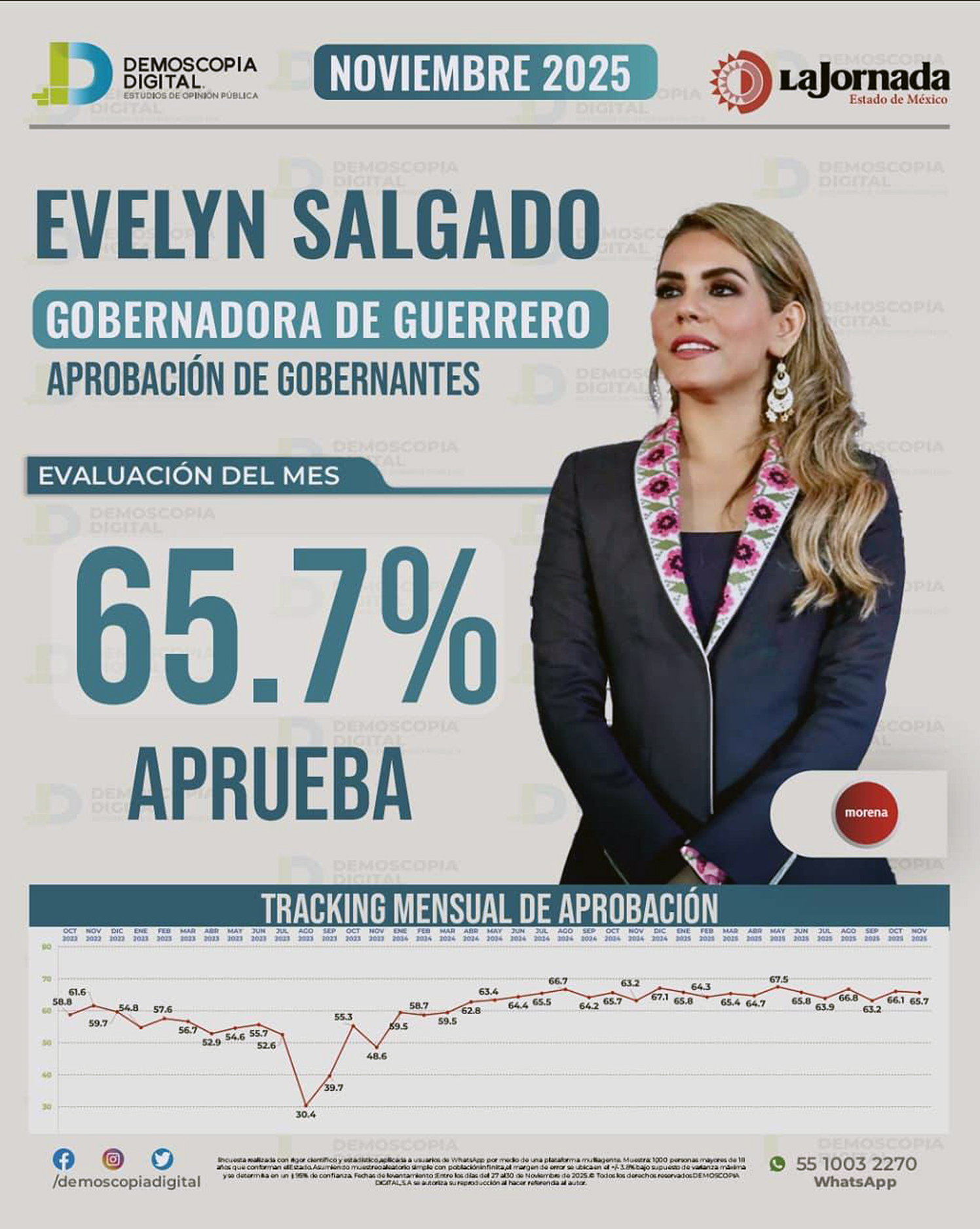 Chilpancingo, Gro., Acuatro años de iniciar su administración, la gobernadora Evelyn Salgado Pineda se posiciona entre los mandatarios estatales con mayor aceptación del país, al registrar un 65.7% de aprobación, de acuerdo con el seguimiento mensual de Demoscopia Digital correspondiente a noviembre de 2025.