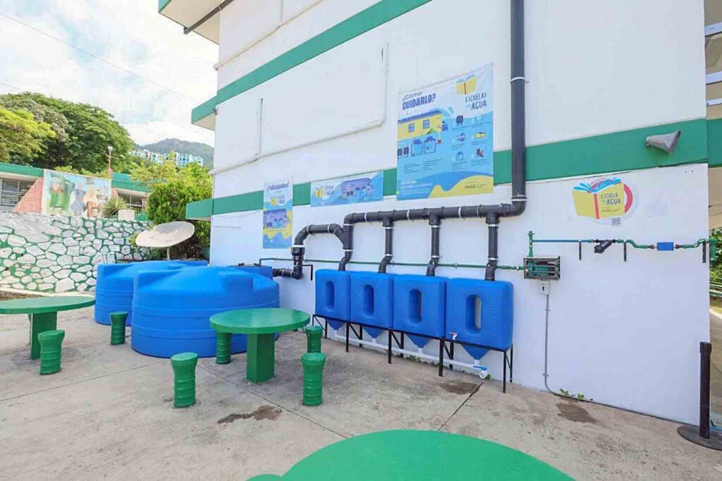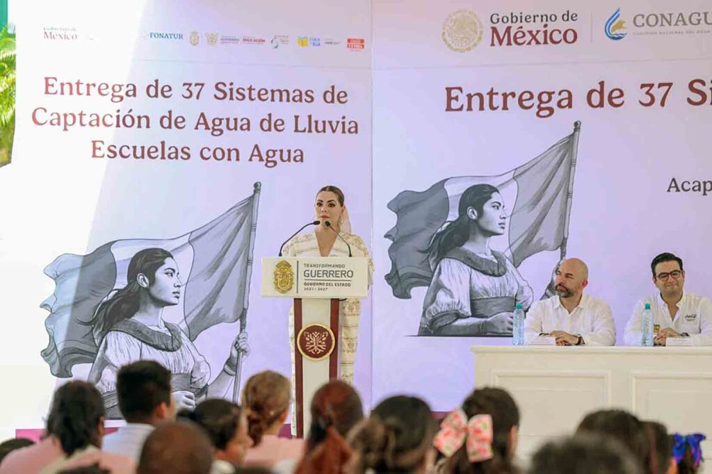 Acapulco, Gro., En una coordinación de esfuerzos entre los tres órdenes de gobierno y la iniciativa privada, la mandataria estatal, Evelyn Salgado Pineda, entregó 37 Sistemas de Captación de Agua de Lluvia del programa “Escuelas con Agua”, beneficiando a más de 7 mil 600 estudiantes, de diferentes instituciones de los municipios de Acapulco, Atoyac y Coyuca de Benítez. Con esta puesta en marcha, se fortalece la distribución y acceso a este servicio básico, construyendo un entorno más digno y sostenible para mejorar las condiciones de desarrollo de las comunidades educativas.