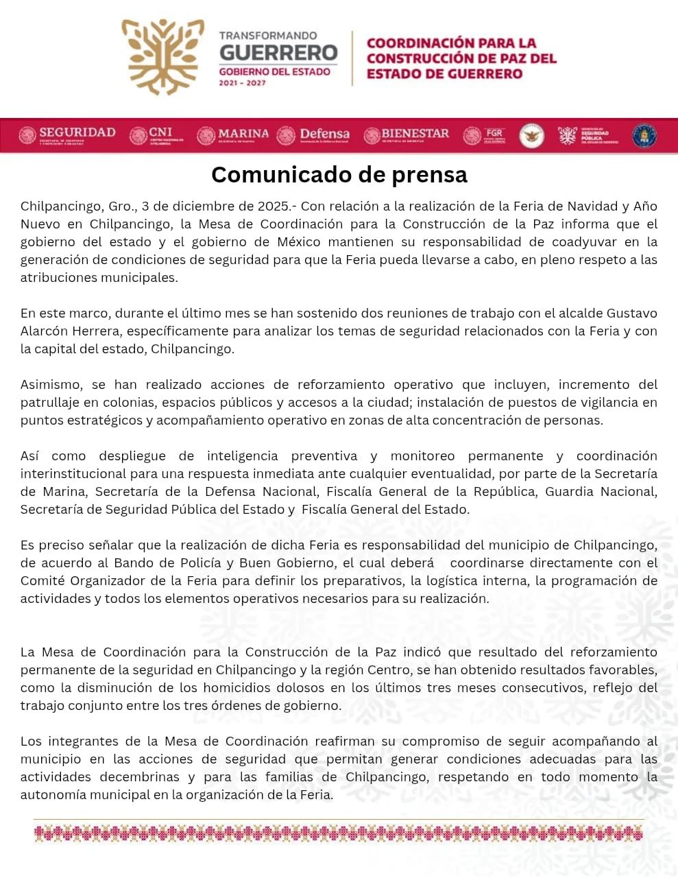 Atoyac, Gro., La realización o no de la Feria de San Mateo, Navidad y Año Nuevo, “es responsabilidad del municipio de Chilpancingo”, advirtió la Mesa de Coordinación para la Construcción de la Paz.