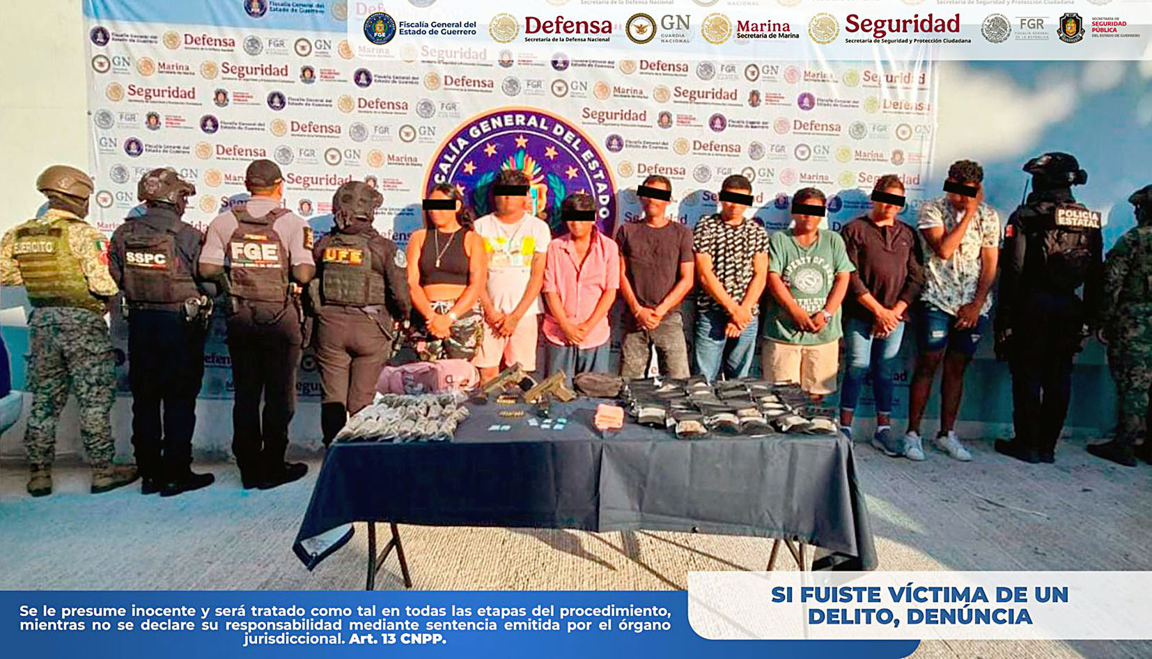 Chilpancingo, Gro., La Fiscalía General del Estado de Guerrero informa que personal de esta institución, en coordinación con DEFENSA, Guardia Nacional (GN), Secretaría de Marina (SEMAR), Secretaría de Seguridad y Protección Ciudadana (SSPC) y Policía Estatal (SSPGro), realizó la detención en flagrancia de Elías “N”, Antonio “N”, Alexis “N”, Carlos “N”, José Luis “N”, José Antonio “N”, José Eduardo “N” y Luz “N”, derivado de recorridos de seguridad y vigilancia en el municipio de Acapulco de Juárez, Guerrero.