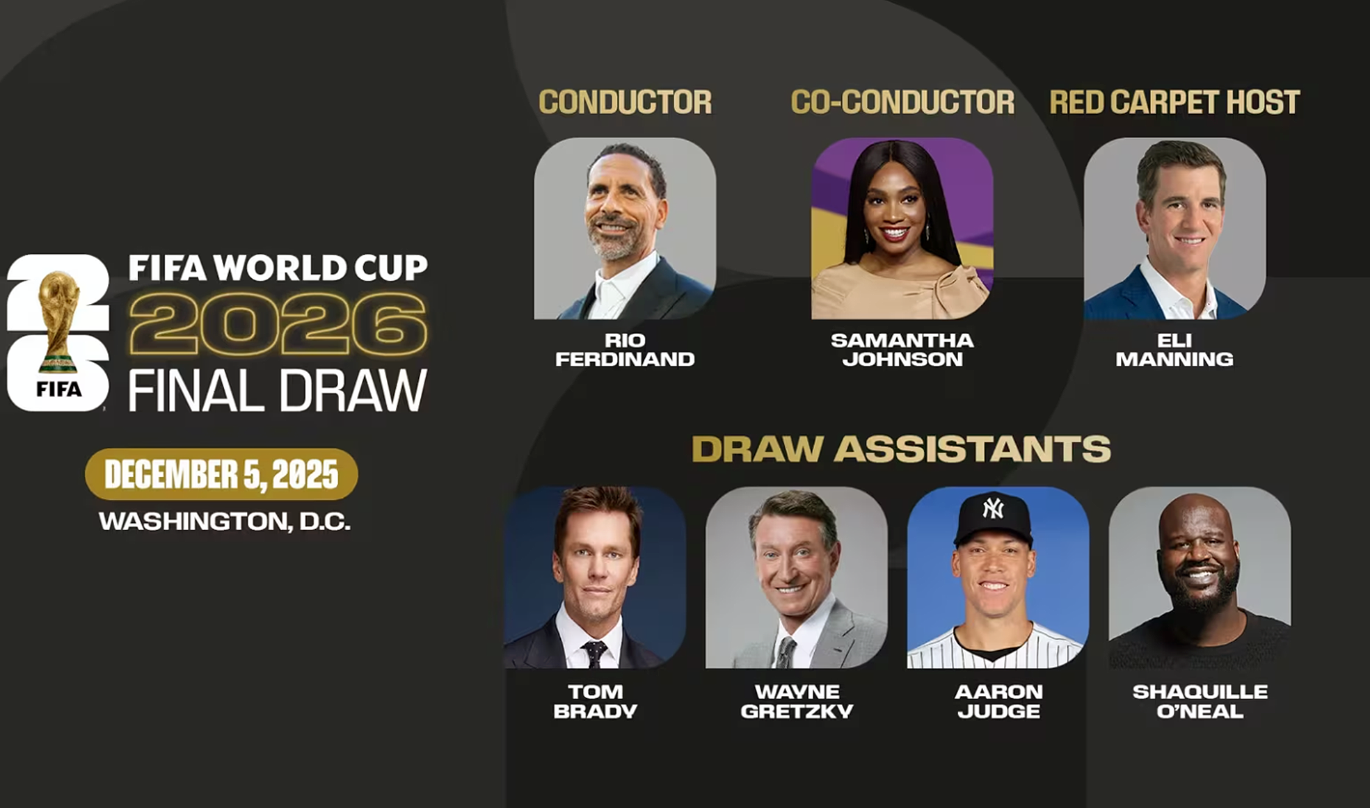 Rio Ferdinand, excapitán de Inglaterra, será el responsable de dirigir el Sorteo de la Copa del Mundo 2026, el cual se celebrará en el icónico Centro John F. Kennedy para las Artes Escénicas de Washington D. C. El exdefensa estará acompañado por la galardonada comentarista internacional Samantha Johnson.