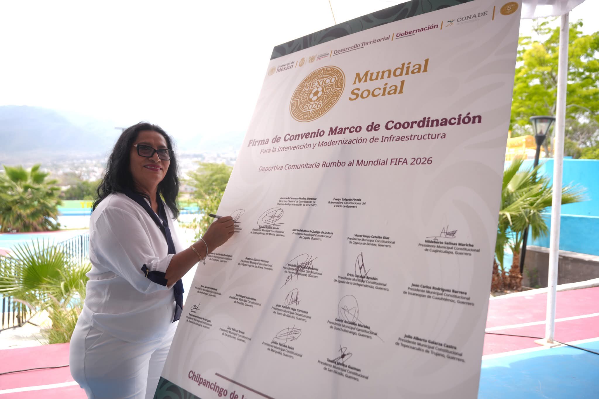 Chilpancingo, Gro., 13 de abril de 2026.- La modernización de infraestructura rumbo al Mundial FIFA 2026 avanzó en la capital del estado con la firma del Convenio Marco de Coordinación para la intervención de espacios públicos y su seguimiento social, acto en el que la presidenta municipal de Acapulco, Abelina López Rodríguez, participó como invitada en la formalización del acuerdo que impulsa acciones en unidades deportivas y centros de convivencia.