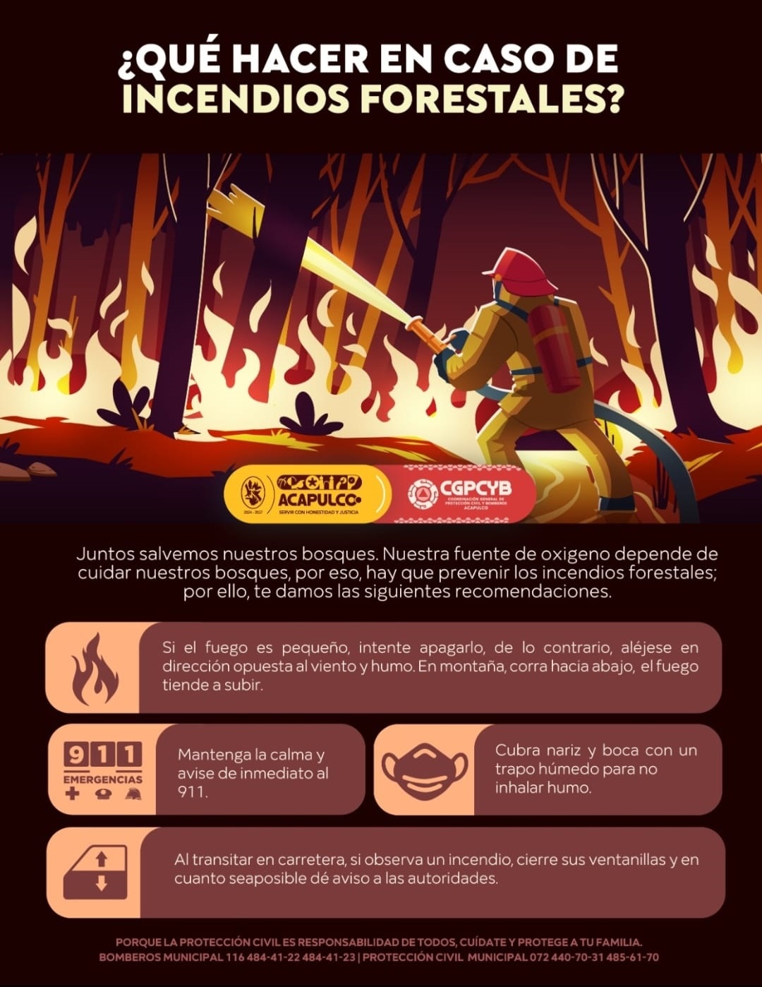 Acapulco, Gro., Enero 9.- Ante el adelanto de la temporada de incendios forestales en el municipio, la Coordinación General de Protección Civil y Bomberos de Acapulco fortalece sus esquemas de prevención y atención, en seguimiento a las indicaciones de la presidenta Abelina López Rodríguez, con la finalidad de reducir riesgos en zonas rurales y áreas de transición urbano-forestal.