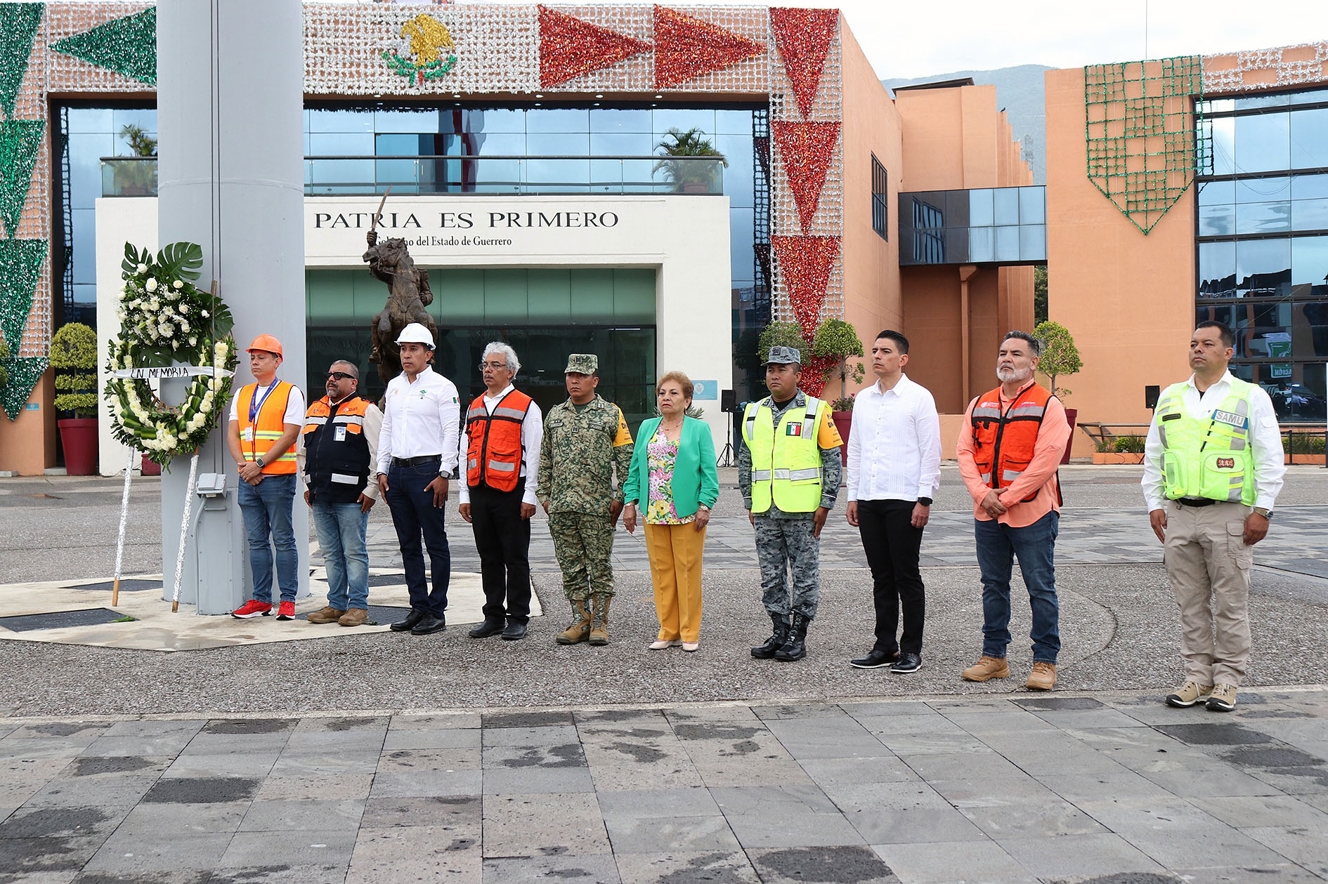 Chilpancingo, Gro., El gobierno del estado a través de la Secretaría de Gestión Integral de Riesgos y Protección Civil, este viernes llevó a cabo la ceremonia de izamiento de bandera a media asta, en memoria de las víctimas de los sismos de 1985 y 2017, acto que fue encabezado por la encargada de despacho de la Secretaría General de Gobierno, Anacleta López Vega, en representación de la gobernadora Evelyn Salgado Pineda.