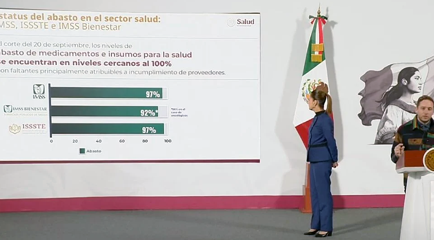 Según el funcionario, al corte del 20 de septiembre, en el IMSS ya se tiene un 97% de abasto de medicamentos, en el IMSS Bienestar en 92% y en el ISSSTE un 97%.