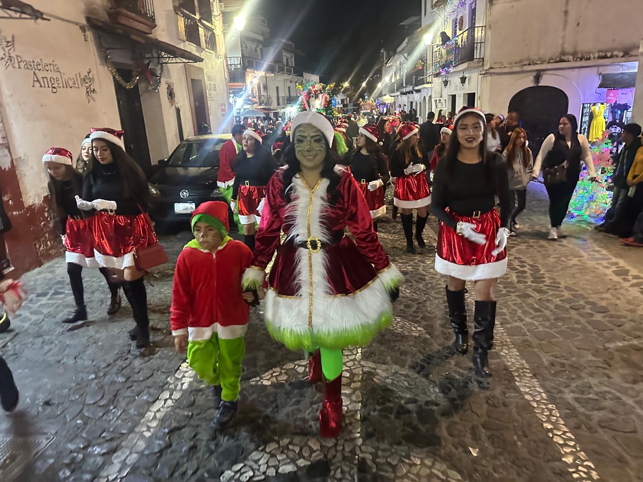 El recorrido por las calles del centro histórico de Taxco estuvo acompañado de personajes emblemáticos como Santa Claus, el Grinch, duendes, renos, muñecos de nieve y figuras de galleta, lo que provocó aplausos y sonrisas entre las y los asistentes, especialmente entre los más pequeños.