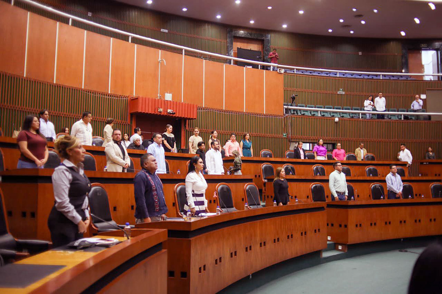 Los 38 legisladores presentes en el salón de pleno, porque cinco solicitaron permiso para llegar tarde, se levantaron de su curul para guardar el minuto de silencio.