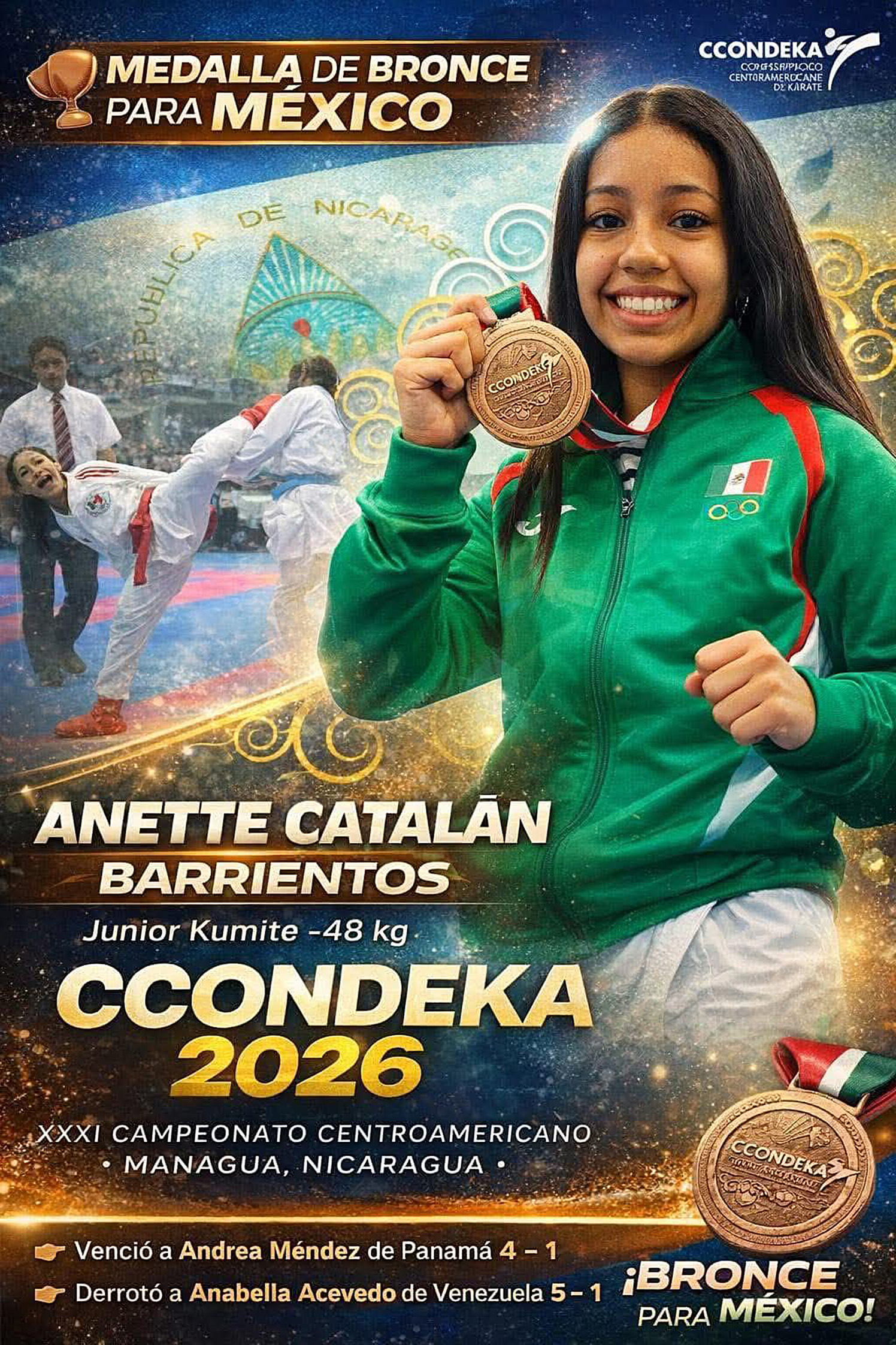 Chilpancingo, Gro., La guerrerense Anette Catalán obtuvo la medalla de bronce en el Campeonato Centroamericano de Karate CCONDEKA 2026, realizado en Managua, Nicaragua, tras una destacada participación frente a competidoras de distintos países de la región.