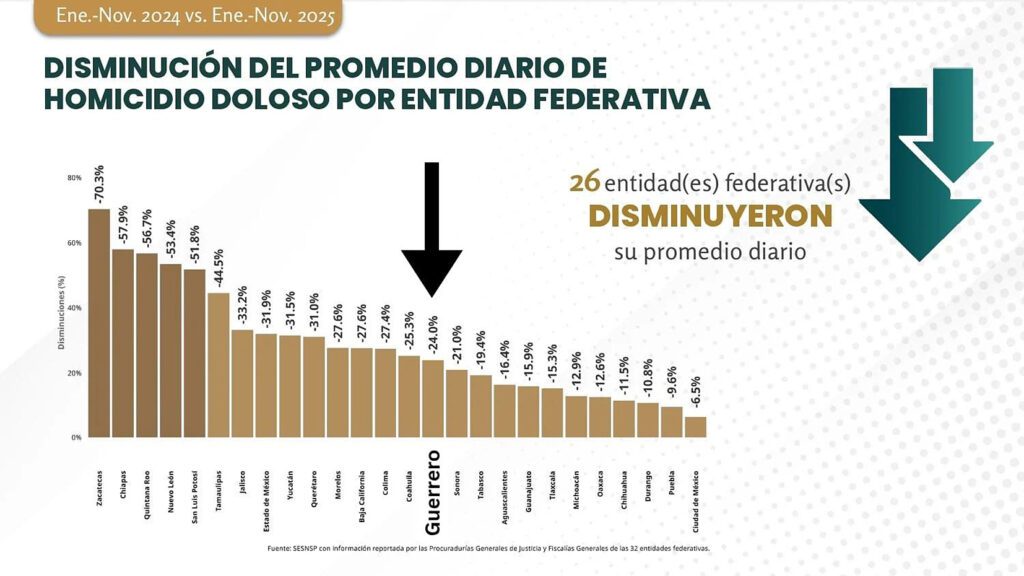 Ciudad de México, El estado de Guerrero registró una reducción histórica del 24 % en homicidios dolosos durante el periodo de enero a noviembre de 2025, en comparación con el mismo lapso del año anterior, informó el Secretariado Ejecutivo del Sistema Nacional de Seguridad Pública (SESNSP).