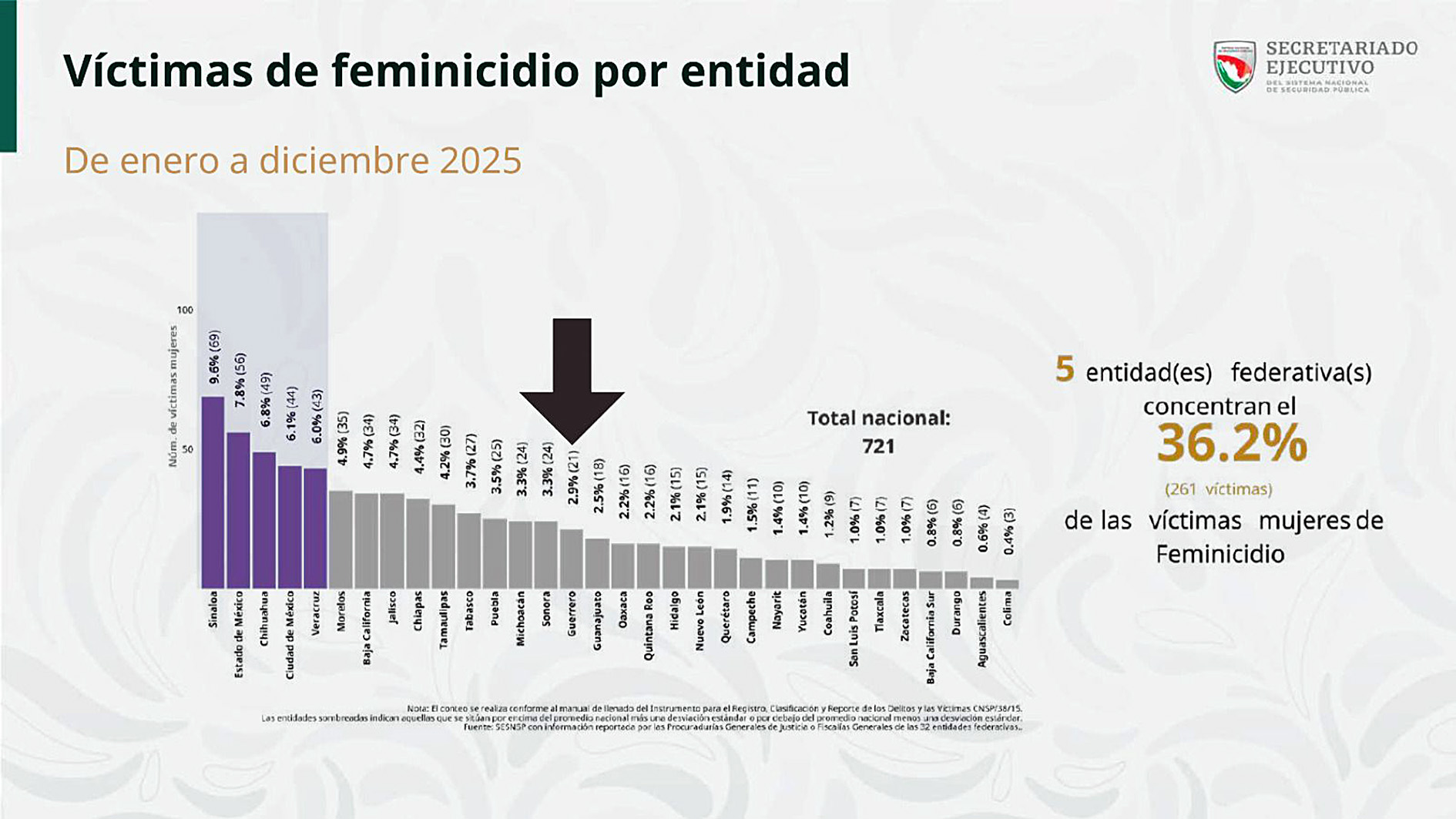 Chilpancingo, Gro., La política de transformación, justicia social y protección integral a las mujeres impulsada por la gobernadora Evelyn Salgado Pineda continúa dando resultados contundentes: hoy Guerrero se encuentra fuera de las cinco entidades del país con mayor número de feminicidios, de acuerdo al informe del Secretariado Ejecutivo de Seguridad Pública correspondiente de enero a diciembre de 2025, reflejo del trabajo permanente para garantizar la seguridad, la vida y los derechos de las guerrerenses.