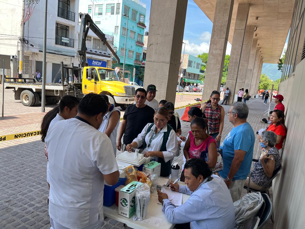 Iguala, Guerrero, Octubre 4.- Este viernes se llevó a cabo una jornada de vacunación en el exterior del palacio municipal para toda la población con la aplicación de la vacuna contra el Covid, hepatitis y sarampión, de parte de enfermeros del IMSS Bienestar.