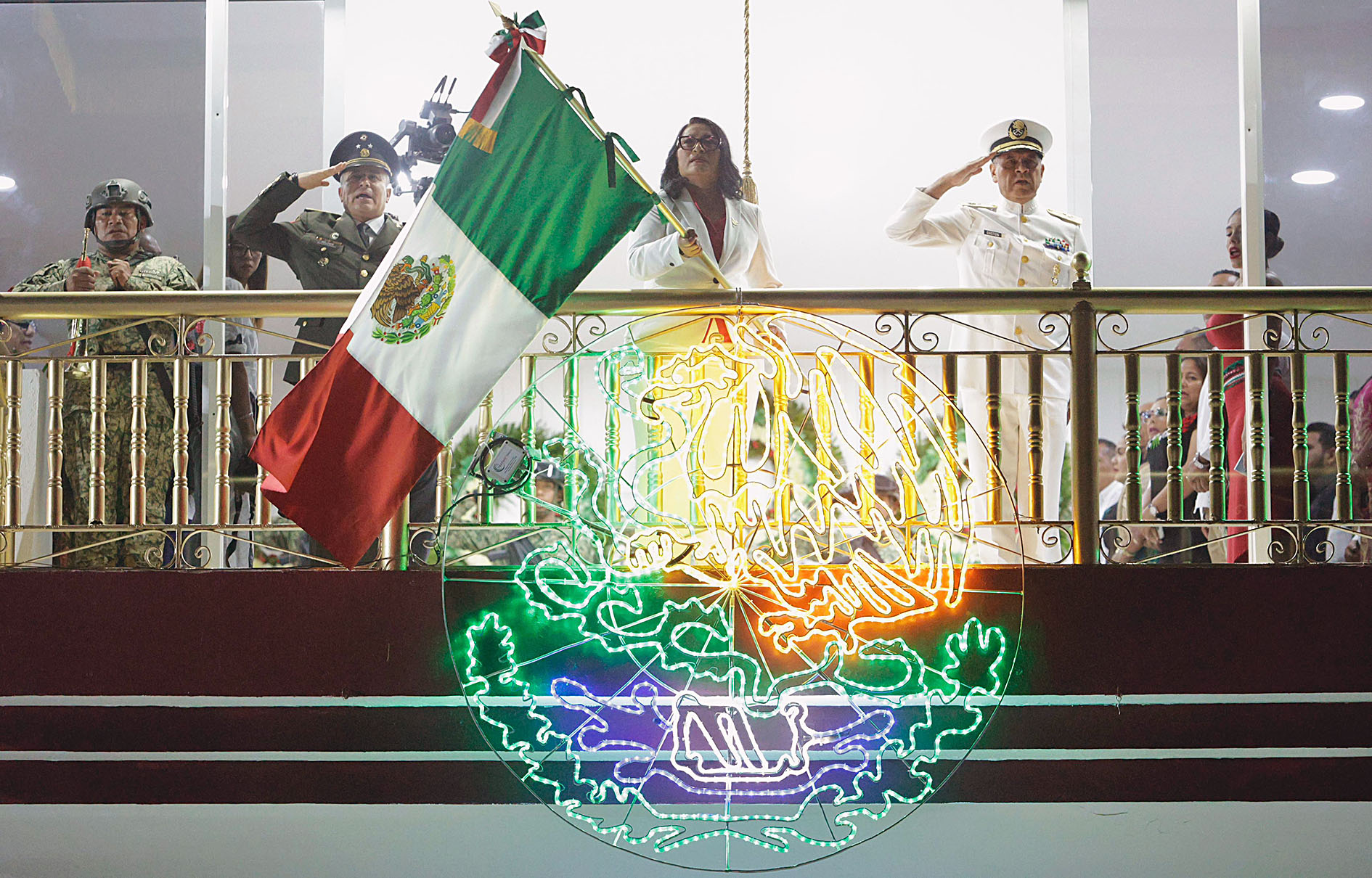 En su arenga desde el balcón, Abelina López Rodríguez ondeó la Bandera Nacional y retomó con fervor patriótico el discurso que en su día pronunciara Miguel Hidalgo y Costilla, manifestando con fuerza:
