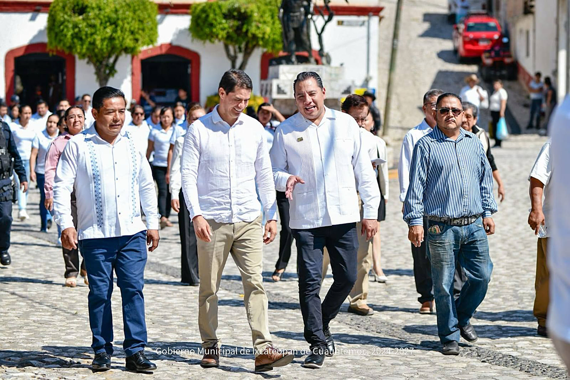 La caravana recorrió las calles empedradas de la cabecera municipal en un ambiente de hermandad entre ambos ayuntamientos, para posteriormente participar en el acto cívico realizado este sábado 8 de febrero, fecha significativa para el Pueblo Mágico de Ixcateopan.