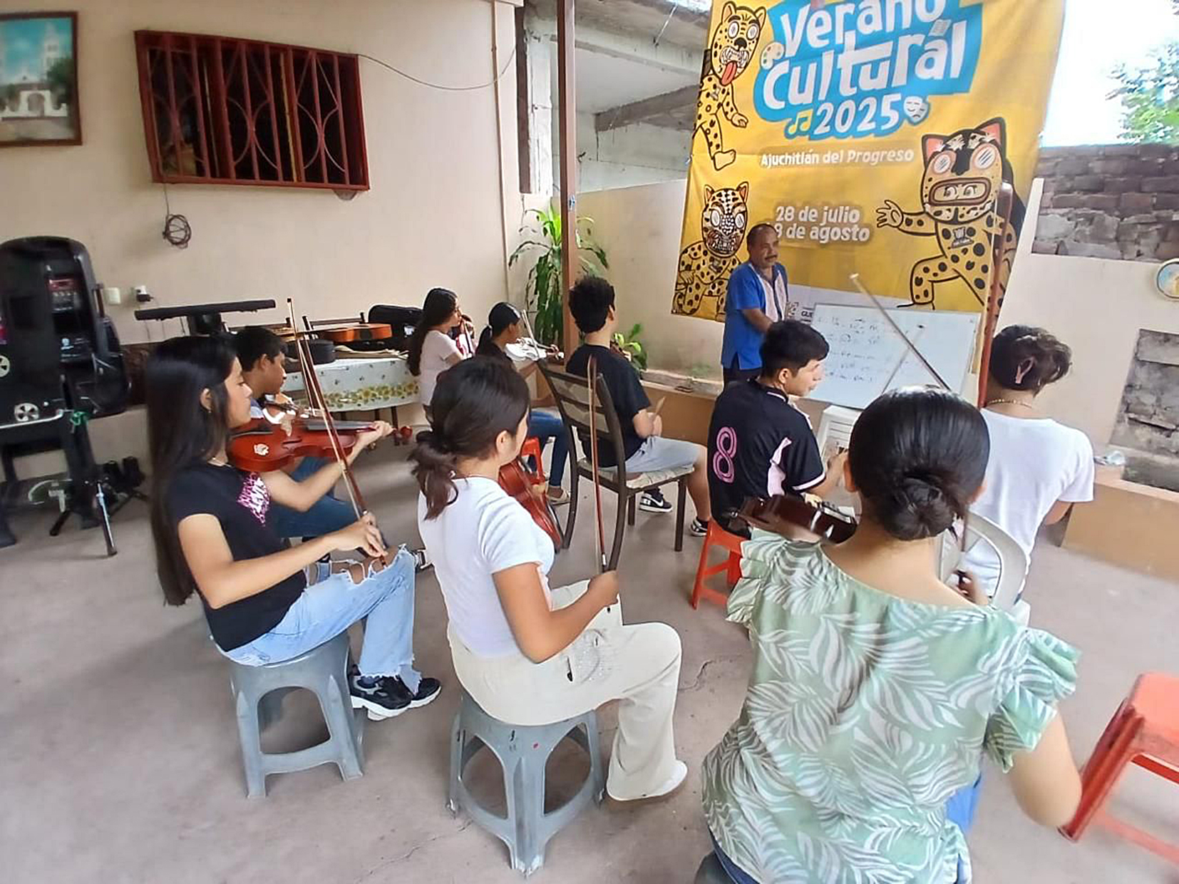 Ajuchitlán, Gro., En el Centro Cultural «Retoños de Ajuchitlán», que dirige María de Los Angeles León Ayala, continúan los niños y adolescentes en el curso de «Verano Cultural», en donde aprenden música, canto y baile tradicional calentano, así como el valor de las tradiciones y costumbres de la región.