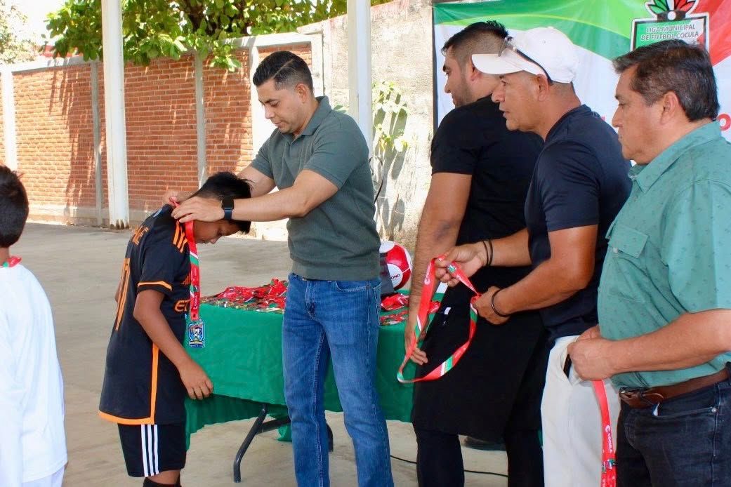 Cocula, Gro., Marzo 23.- El presidente municipal de Cocula, Arq. Raymond Román Alarcón, encabezó la premiación de la gran final de fútbol en la categoría pony, donde el equipo Cañeros se coronó campeón tras imponerse a Dep. Cocula.