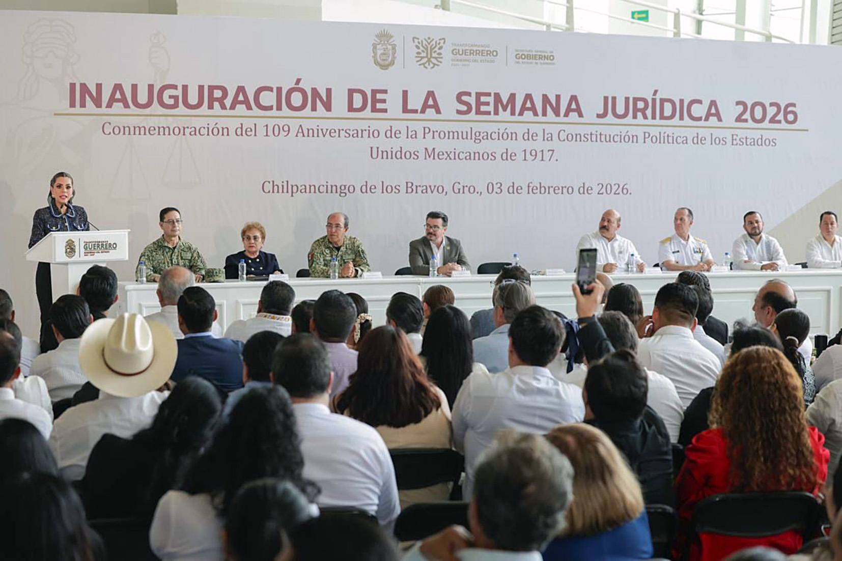 Chilpancingo, Gro., Al inaugurar los trabajos de la Semana Jurídica 2026, en el marco del 109 aniversario de la promulgación de la Constitución Política de los Estados Unidos Mexicanos de 1917, la gobernadora Evelyn Salgado Pineda convocó a seguir construyendo un Guerrero donde la ley deje de ser distante al pueblo y se convierta en una garantía viva de igualdad, justicia y paz social.