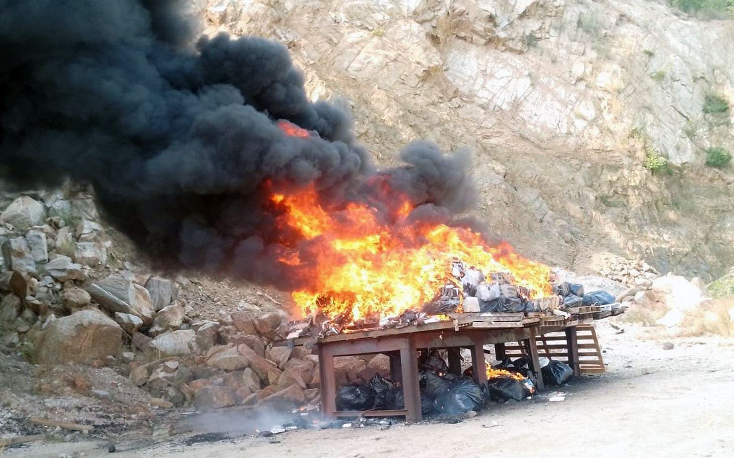 Acapulco, Gro., El gobierno federal informó que este jueves fueron incineradas casi cinco toneladas de cocaína en el relleno sanitario de Paso Texca, en Acapulco. El cargamento corresponde a diversos decomisos realizados durante este año en las costas de Guerrero.